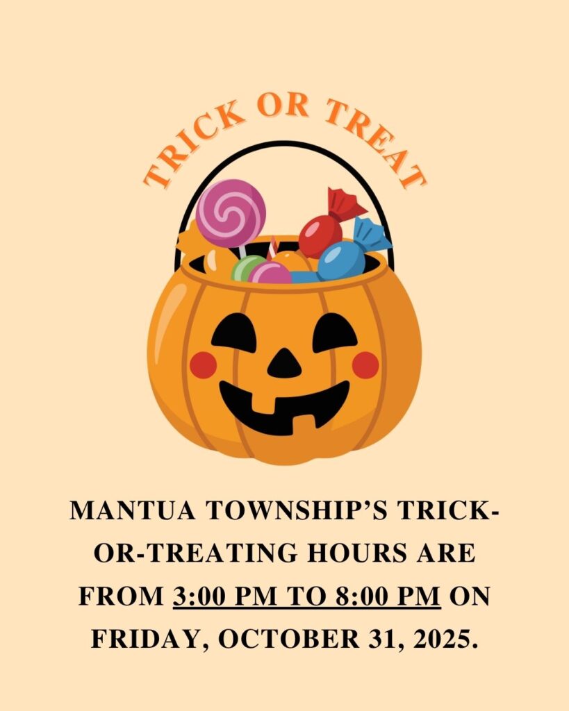 Happy Halloween! Trick-or-Treating will start at 3:00 P.M. and end at 8:00 P.M. on Friday, October 31, 2025, in Mantua Township.
